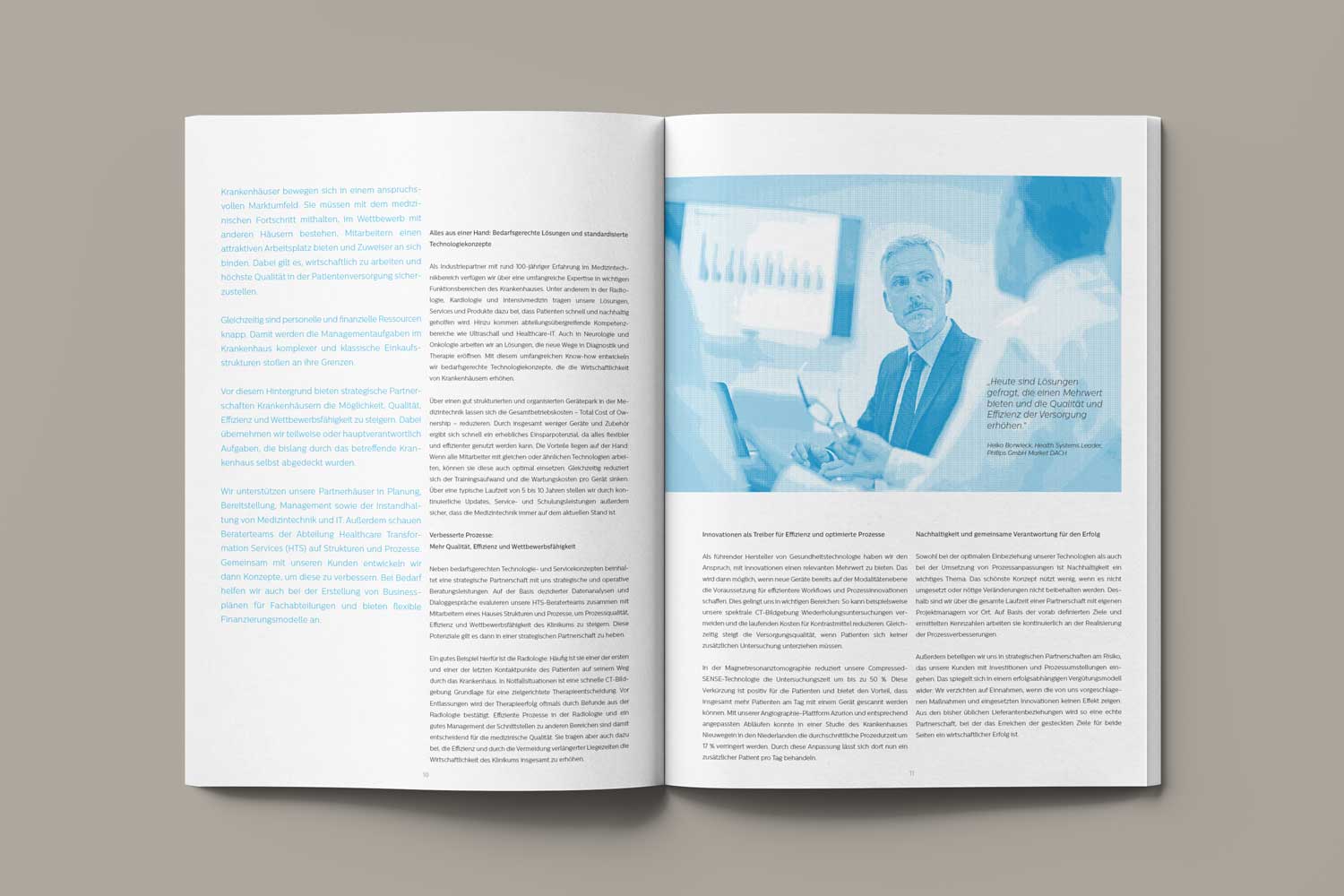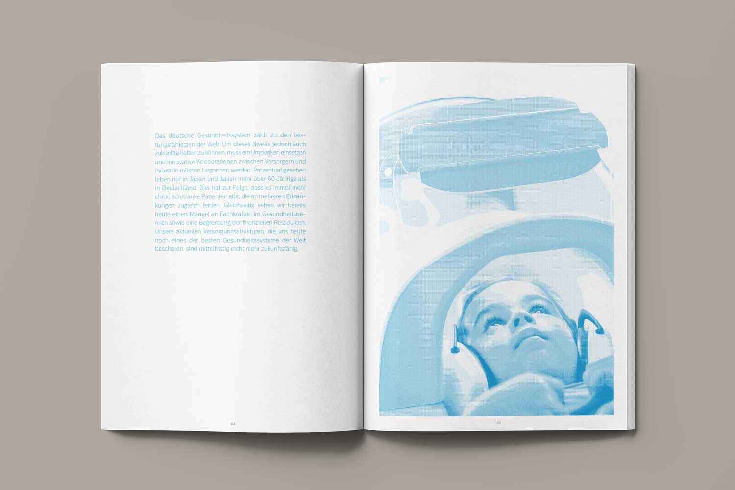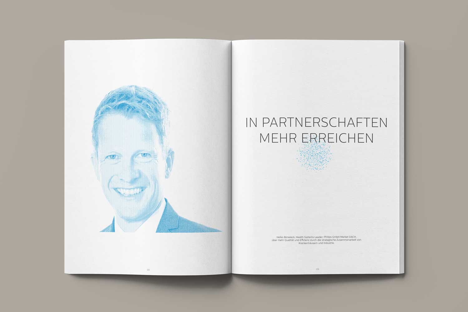 Mit der Publikation "Eine Standortbestimmung zur zukunftssicheren Gesundheitsversorgung" geht Philips einen neuen Weg der Image-Kommunikation für den Gesundheitsmarkt im DACH-Raum. Für das Format wurde nicht wie üblich DIN A4 sondern ein etwas größeres Maß gewählt, wodurch das Buch bereits optisch stärker wahrgenommen wird. Die Bilder der Fachartikel sind monochrom, ruhig, zurückhaltend und durch die durchgängige blaue Rasteranmutung unique. Für die Case-Studies wurden klassische, eingebundene 6-Seiter gewählt. Hier sind die Portraits der Kunden in schwarz-weiß und die Bilder aus den Kliniken in 4c gehalten. Entstanden ist eine moderne und abwechslungsreiche Themen- und Bildgeschichte, die das gesamte medizinische Leistungsspektrum des Hauses lebendig und doch dem Image entsprechend puristisch charaktervoll beleuchtet. Thematisch pointiert gegliedert und reduziert auf das Wesentliche erzielte die Publikation – vor allem in ihrer Gestaltung jenseits des klassischen Mainstreams – in der Branche eine große Aufmerksamkeit.