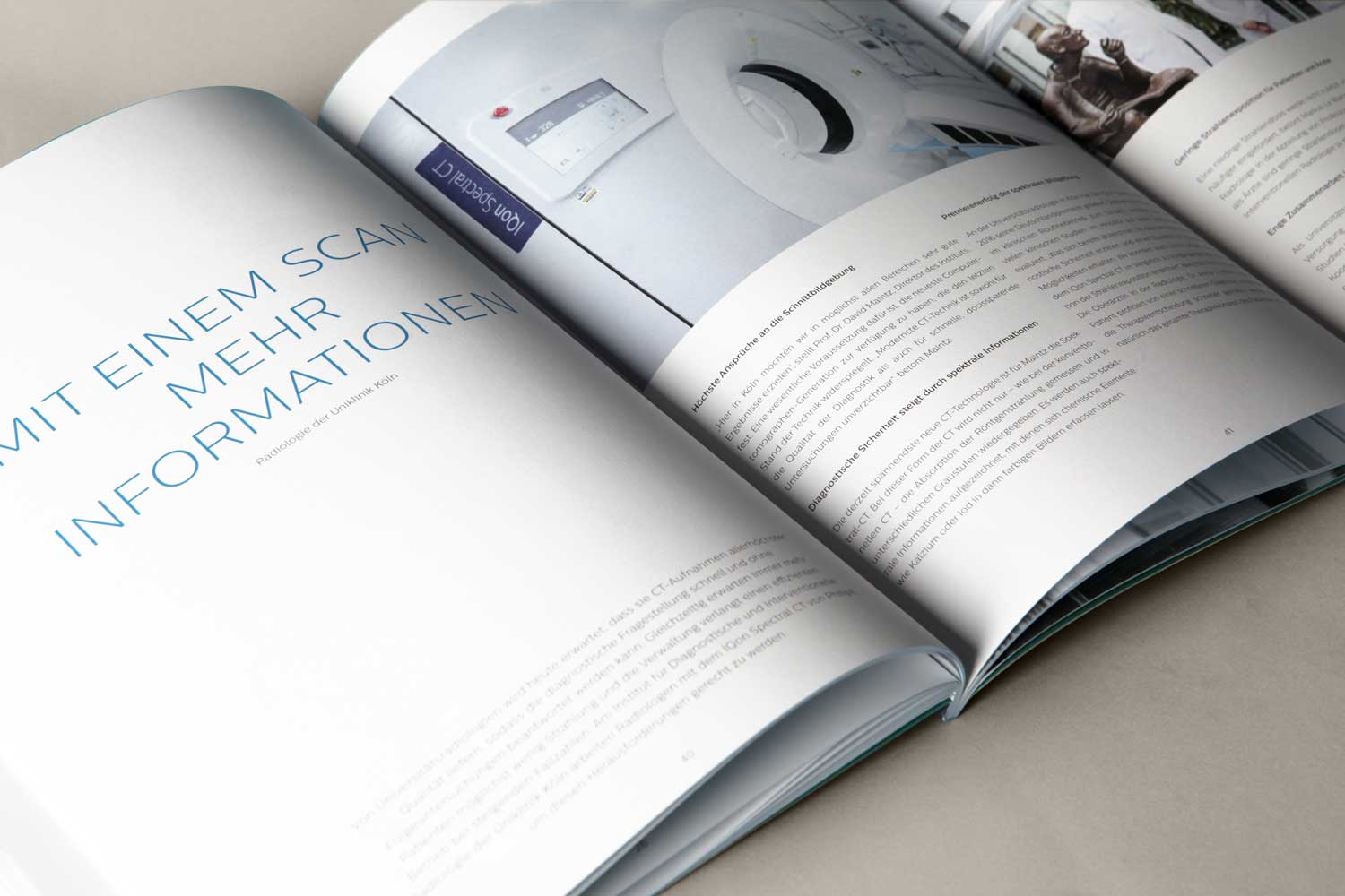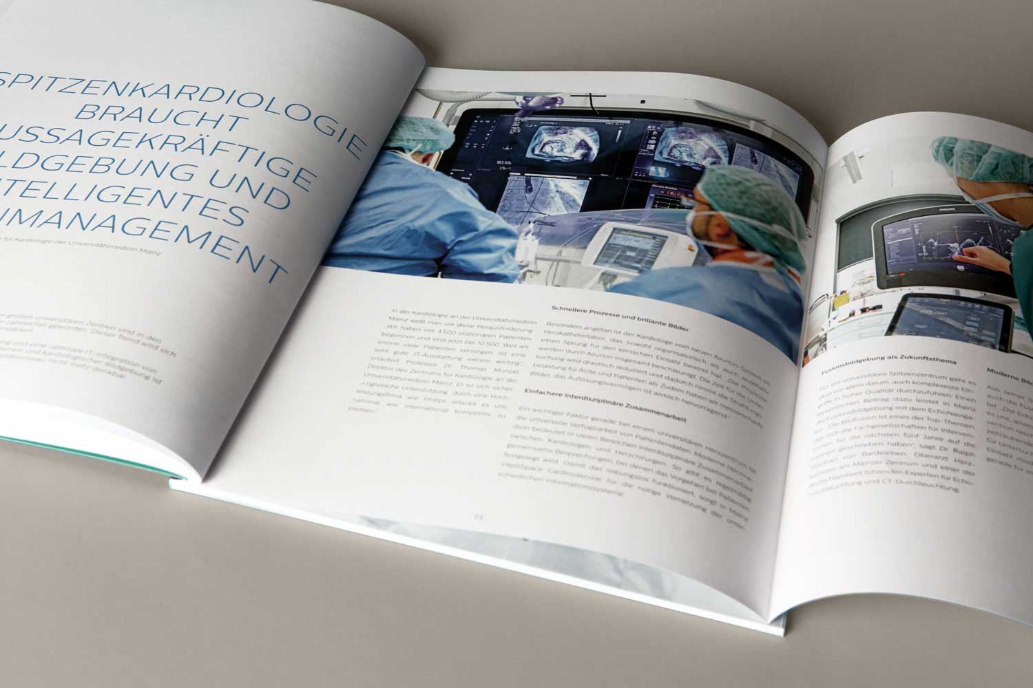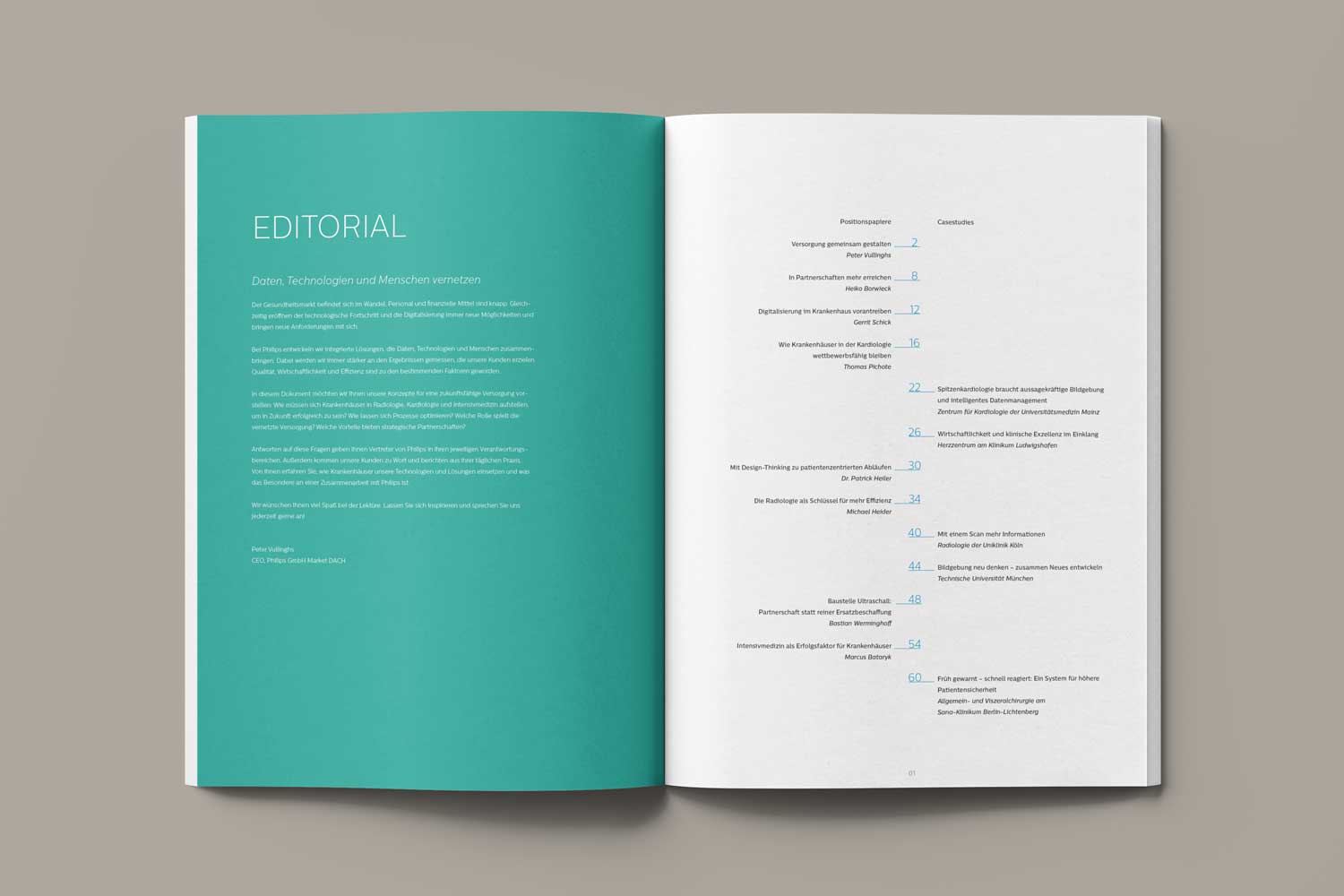 Mit der Publikation "Eine Standortbestimmung zur zukunftssicheren Gesundheitsversorgung" geht Philips einen neuen Weg der Image-Kommunikation für den Gesundheitsmarkt im DACH-Raum. Für das Format wurde nicht wie üblich DIN A4 sondern ein etwas größeres Maß gewählt, wodurch das Buch bereits optisch stärker wahrgenommen wird. Die Bilder der Fachartikel sind monochrom, ruhig, zurückhaltend und durch die durchgängige blaue Rasteranmutung unique. Für die Case-Studies wurden klassische, eingebundene 6-Seiter gewählt. Hier sind die Portraits der Kunden in schwarz-weiß und die Bilder aus den Kliniken in 4c gehalten. Entstanden ist eine moderne und abwechslungsreiche Themen- und Bildgeschichte, die das gesamte medizinische Leistungsspektrum des Hauses lebendig und doch dem Image entsprechend puristisch charaktervoll beleuchtet. Thematisch pointiert gegliedert und reduziert auf das Wesentliche erzielte die Publikation – vor allem in ihrer Gestaltung jenseits des klassischen Mainstreams – in der Branche eine große Aufmerksamkeit.