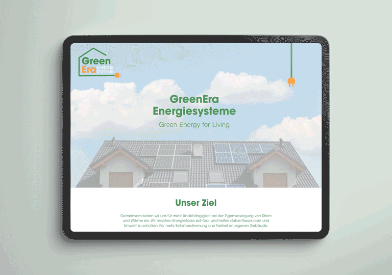 Für Green Era haben wir das Logo, die Icons und das Webdesign für eine energieeffiziente Onepager-Webseite entwickelt. Der Onepager verbraucht weniger CO₂ als herkömmliche Webseiten, was die umweltbewusste Philosophie von GreenEra unterstreicht. Die moderne, benutzerfreundliche Gestaltung vermittelt die Themen Eigenversorgung und intelligente Energienutzung klar und ansprechend. Durch eine klare Struktur und intuitive Navigation sorgt die Webseite für eine nachhaltige Markenpräsentation und verbessert die User Experience, während sie gleichzeitig die Werte von GreenEra in den Vordergrund stellt.