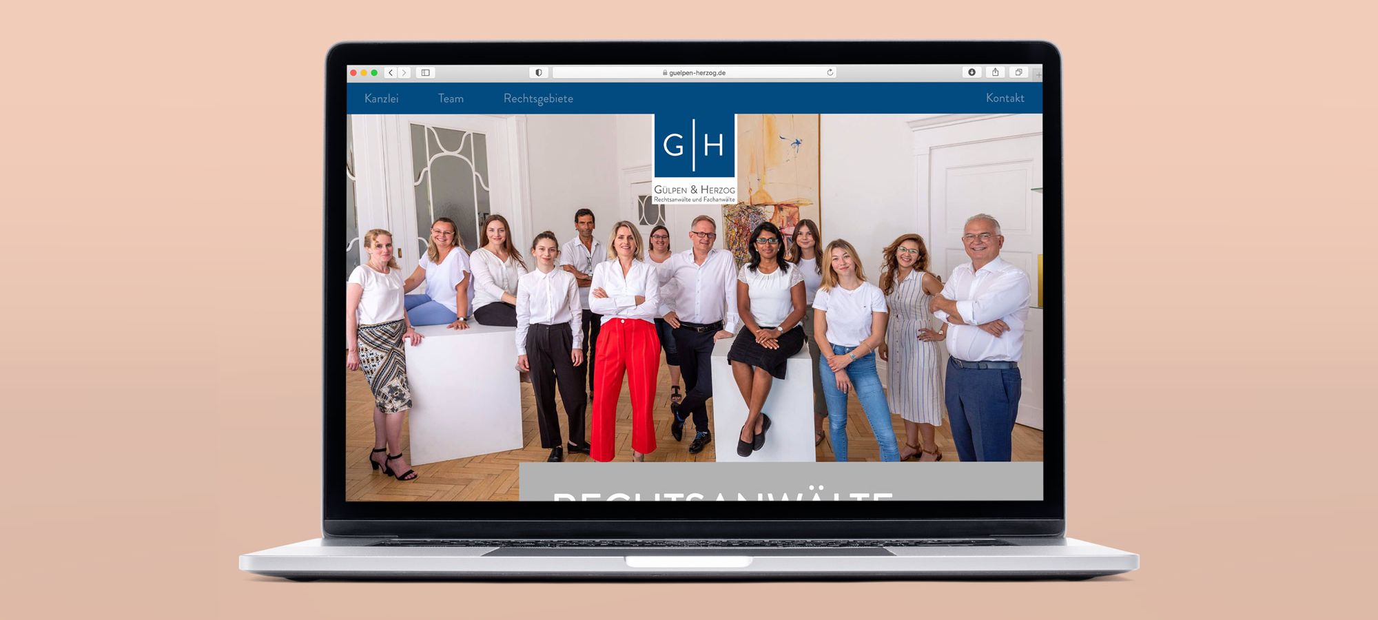 Die neu gegründete Kanzlei Gülpen & Herzog bekam ein kompettes Corporate Design, das zugleich Seriosität und Agilität der Kanzlei widerspiegelt. Von der Entwicklung des Logos über die Gestaltung verschiedener Klassiker wie Briefbogen, Visitenkarten usw. bis hin zur Webseite.