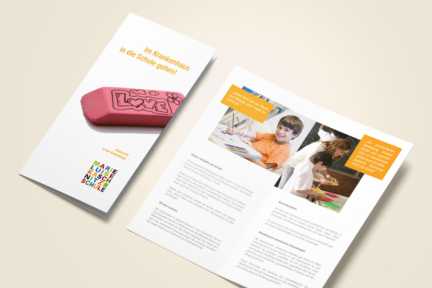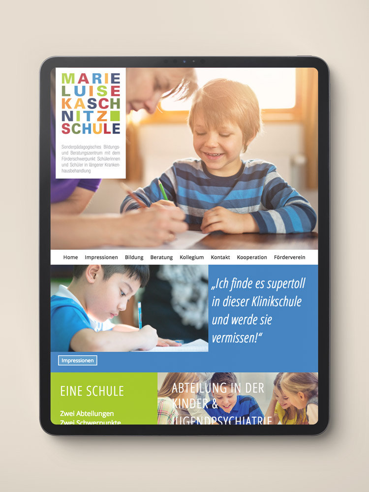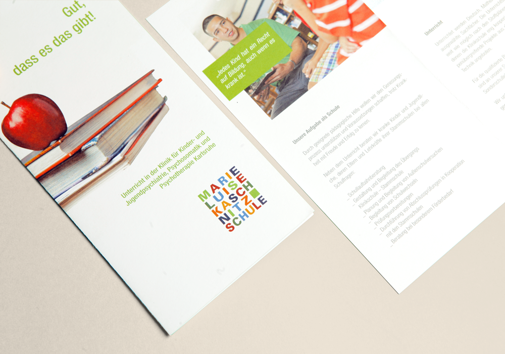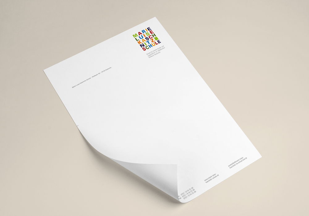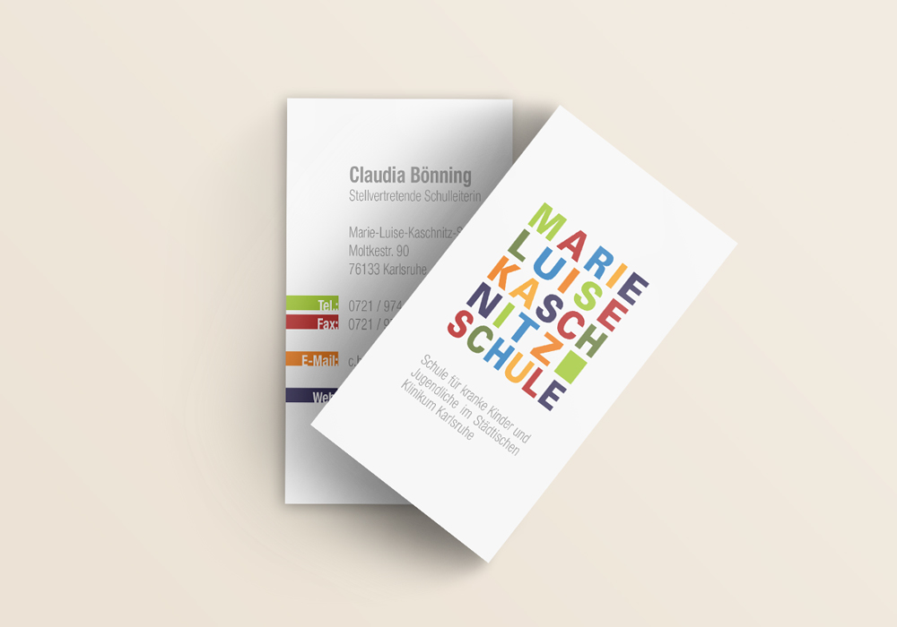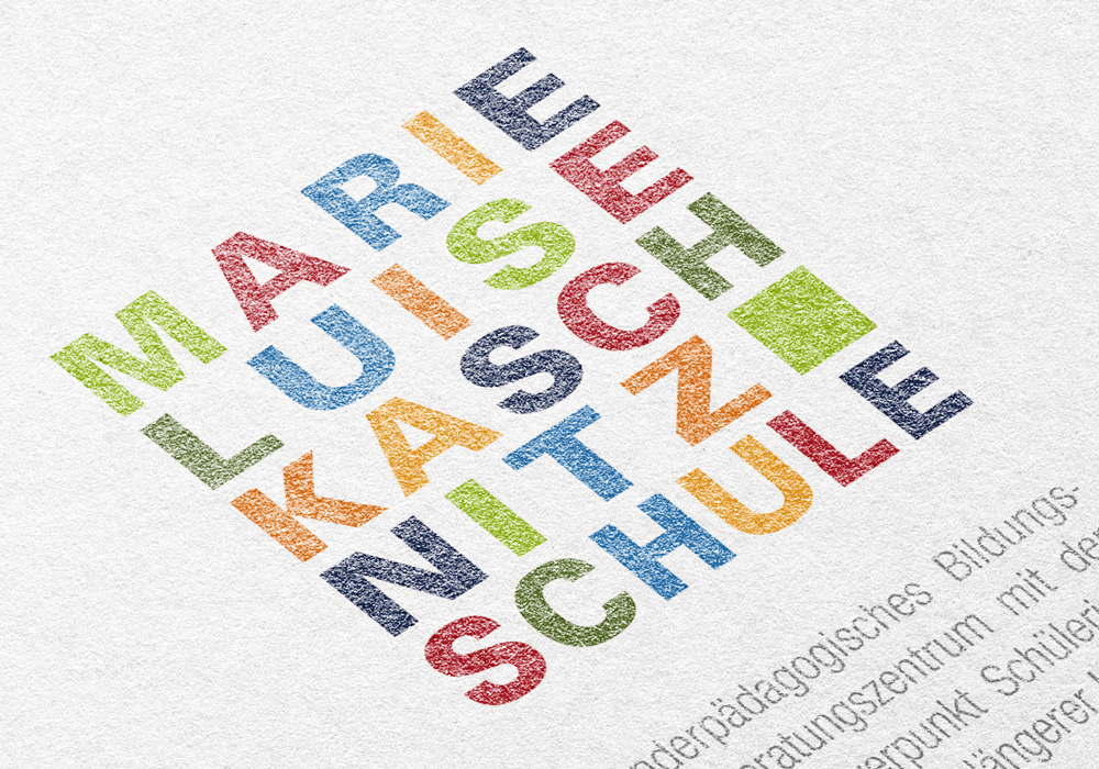 Die Leitung der "Klinikschule" wünschte sich ein freundliches Logo. Mit Marie Luise Kaschnitz Schule mussten wir einen langen Namen umsetzen. So kamen wir zu der Lösung, den Namen als Wortmarke zu gestalten, deren Farbspiel ein positives Signal setzt und sich zugleich auf die Farbgestaltung des Schulgebäudes bezieht. Der Einsatz von Farbflächen wurde dann auch ein durchgängiges Gestaltungselement für das gesamte Erscheinungsbild der Schule.