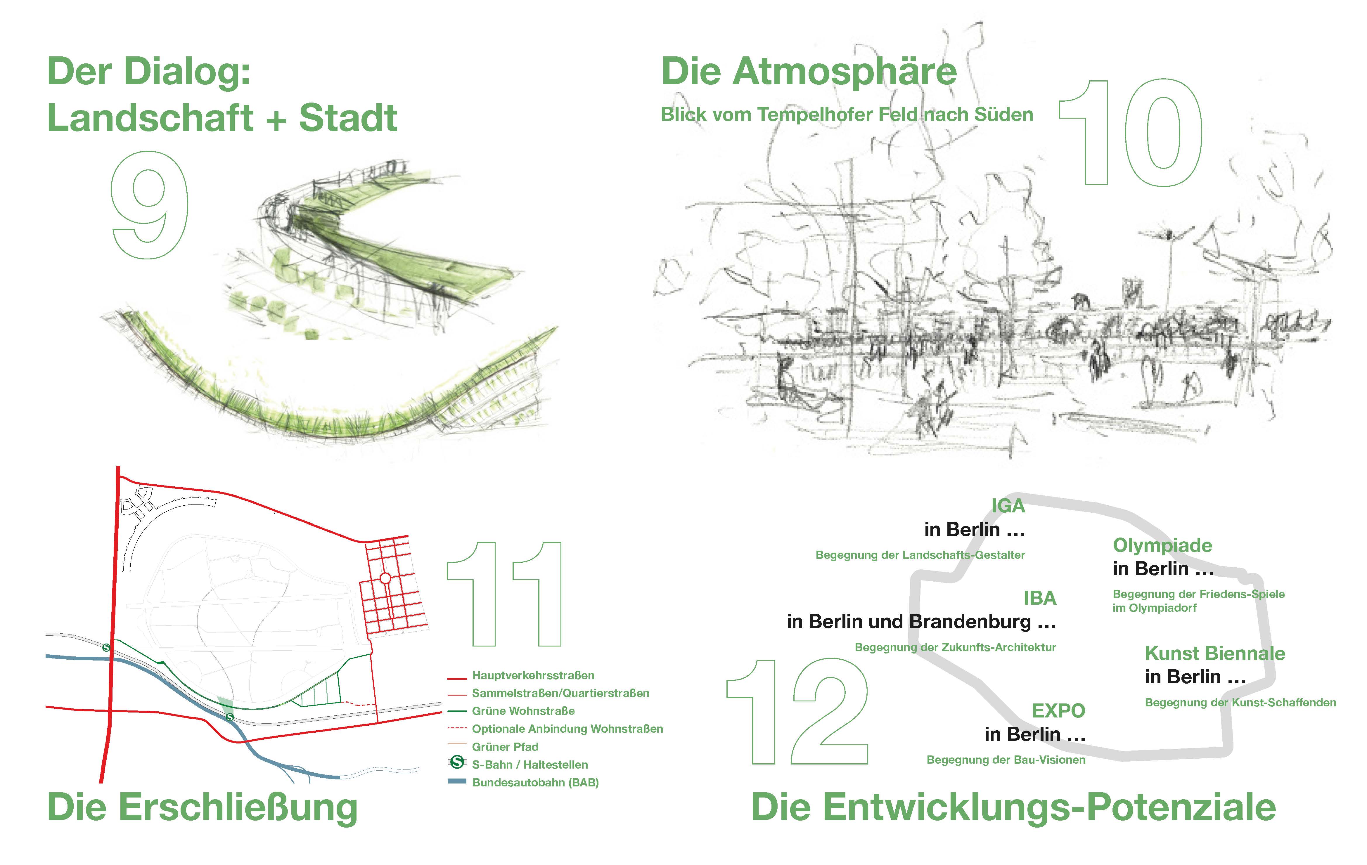 Der Kern des Vorschlags ist eine Begrenzung der Bebauung auf den Randbereich, während die zentrale Freifläche von 355 Hektar im Wesentlichen unangetastet bleibt. Als „Bebauung und doch keine Bebauung“ sieht das Konzept keine dominierenden Hochbauten vor. Stattdessen sollen sich terrassierte, drei- bis viergeschossige Baukörper als „Grüne Hügel“ oder „Hängende Gärten“ in die Landschaft einfügen. Diese Bauten sollen die bestehende Baum- und Gebäudekulisse nicht überragen und so den Weitblick über das Feld erhalten.